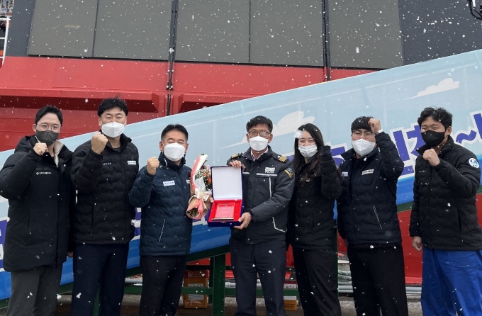 인천해경 해양오염방제과 직원과 고려고속훼리 직원들이 모범선박 선정 기념촬영을 하고 있다.