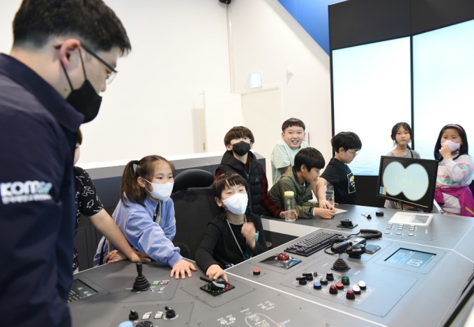 27일 세종시 해밀초등학교 학생들이 한국해양교통안전공단에서 진행된 '선박운항 및 해운분야 진로탐색 체험 프로그램'에 참여해 선박조종시뮬레이션센터에서 선박운항 체험을 하고 있다.