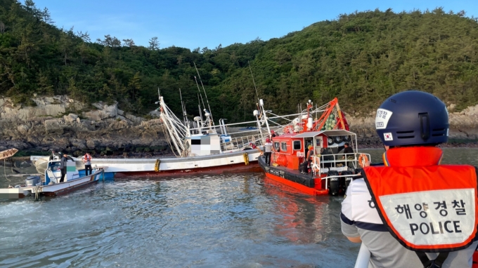 지난 4일 어선 침수 신고를 접수한 해경이 현장에서 안전조치를 하고 있다.