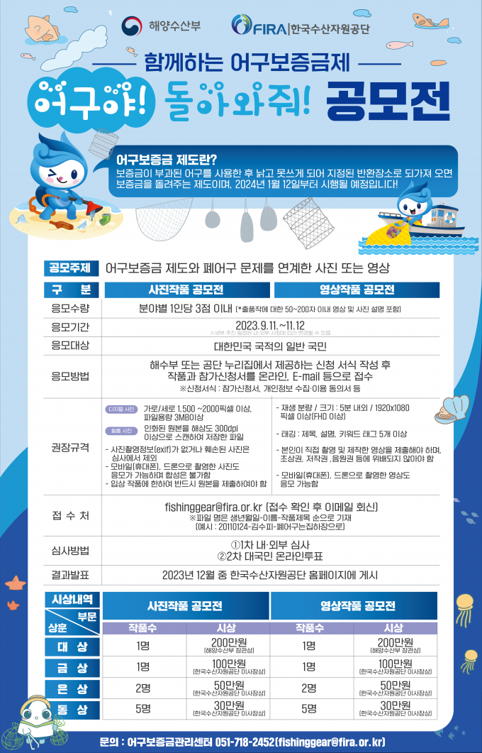 공모전과 관련된 자세한 내용은 한국수산자원공단 어구보증금관리센터(051-718-2452, fishinggear@fira.or.kr)로 문의하면 된다.