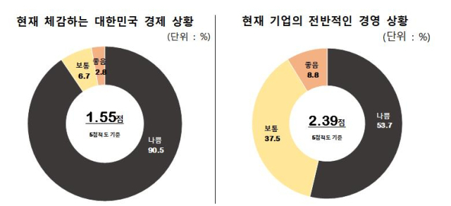 응답 벤처기업의 90.5%는 현재 국가 경제 상황을 '나쁘다'고 진단했으며 53.7%는 기업의 전반적인 경영 상황이 부정적이라고 평가했다.