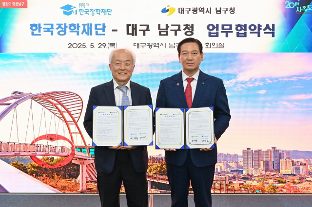 한국장학재단(이사장 배병일)은 지난 29일 대구 남구청(구청장 조재구)과 구청 회의실에서 지역 청년 인재 양성과 지역 발전을 위한 업무협약(MOU)을 체결했다.