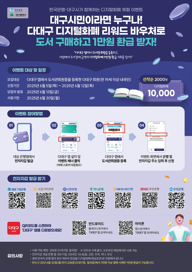이번 행사는 한국은행이 추진 중인 '디지털화폐 활용성 테스트'의 일환으로 마련됐다. 선정된 시민은 실제 상점에서 디지털화폐로 결제하며 사용성·편의성을 경험하게 된다. 체험 대상자는 디지털화폐를 통해 교보문고 대구점 또는 칠곡점에서 1만원 이상 결제 시 사용할 수 있는 리워드 바우처를 제공받는다.