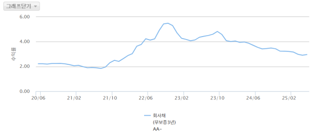 5일 투자은행(IB) 업계에 따르면 A급 공모 회사채 발행금리는 지난 5월부터 2% 후반 수준을 유지하고 있다. 금융투자협회 채권정보센터 통계를 보면 회사채 무보증 3년 AA-급 금리는 2022년 3월 이후 3년여 만에 처음으로 2%대에 진입했다.