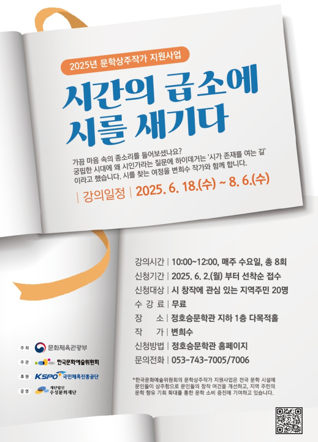 정호승문학관이 한국문화예술위원회가 주관하는 '2025년 문학상주작가 지원사업'의 일환으로 오는 18일(수)부터 시 창작 프로그램 '시간의 급소에 시를 새기다'를 운영한다.