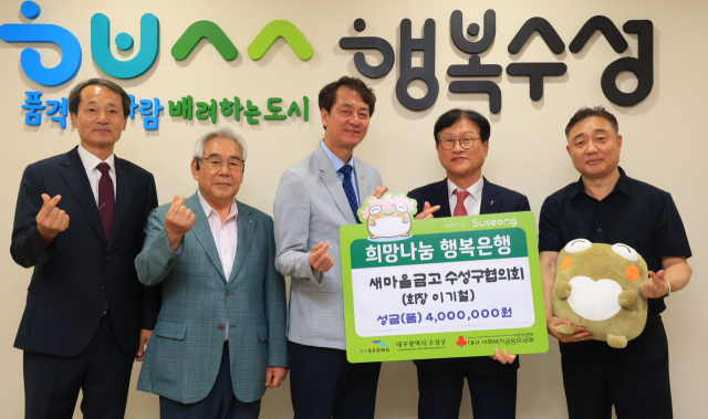 새마을금고수성구협의회(회장 이기철)는 지난 12일 제5회 '지역상생의 날(5월 25일)'을 기념해 성금 및 성품 400만 원을 대구 수성구(구청장 김대권)에 전달했다.새마을금고수성구협의회는 수성구 내 11개 새마을금고 이사장과 전무로 구성돼 있다.