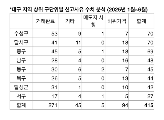 14일 한국인터넷자율정책기구(KISO) 부동산매물클린관리센터의 '2025년 상반기 허위매물 통계 분석' 자료에 따르면 1월부터 6월까지 대구에서 확인된 허위매물은 415건이었다.