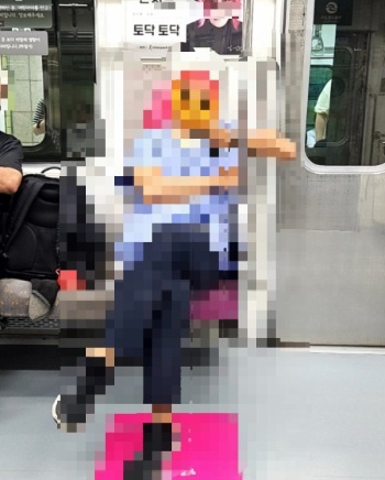 수술복 입은 채 지하철 임산부 배려석에 앉은 의사의 사진이 온라인 커뮤니티를 통해 확산하고 있다.