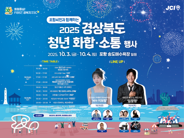 행사는 첫날인 3일 유튜버 '김간날'과 함께하는 청년 토크콘서트를 시작으로 프리스타일 댄스팀 '세븐' 공연, 지역 푸드페스타 '식식한잔', 제56차 경북지구JC 회원대회 개막식 등이 이어진다. 이날 저녁에는 씨야 출신 보컬 이보람이 무대에 올라 특별한 무대를 선보인다.